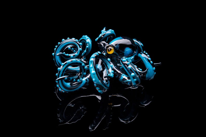 This black and blue handmade glass octopus figurine is a stunning representation of marine beauty. Created from borosilicate glass with intricate tentacle accents using lampwork techniques, it is perfect for collectors, sea-themed decorations, or as a meaningful gift. Every piece is individually handmade with care and artistic precision.