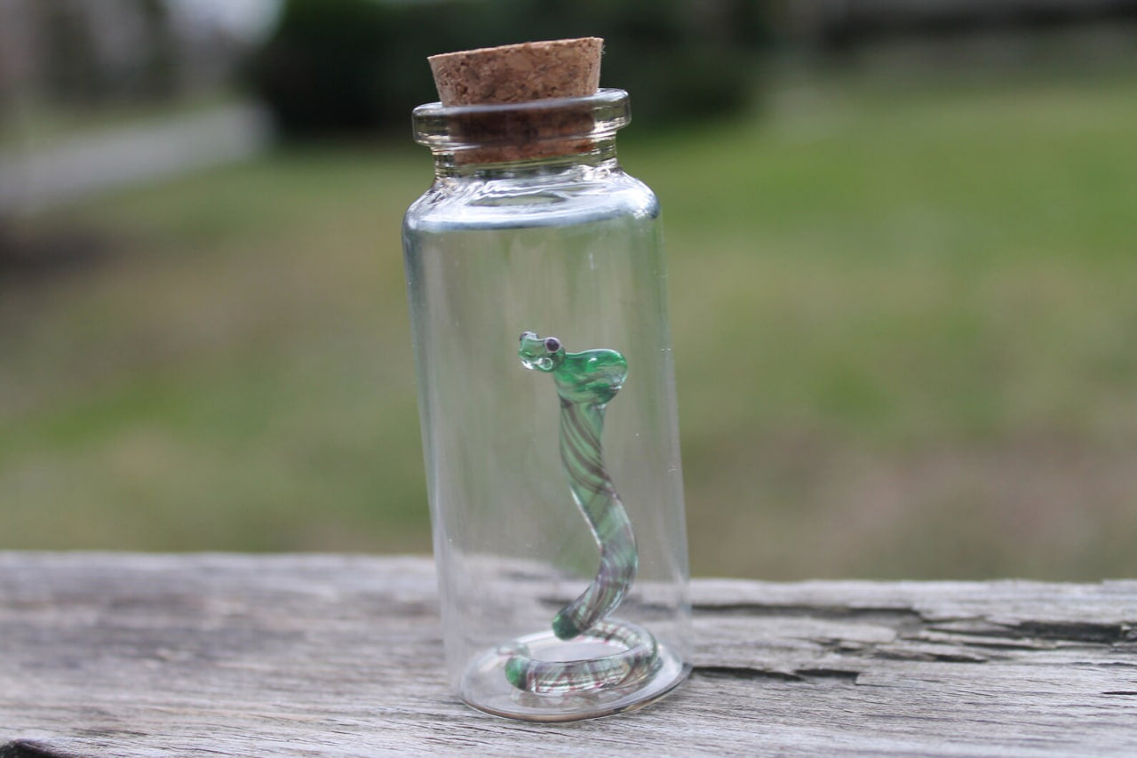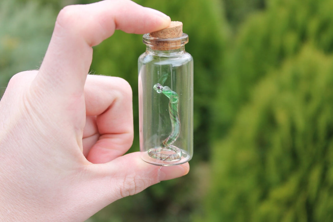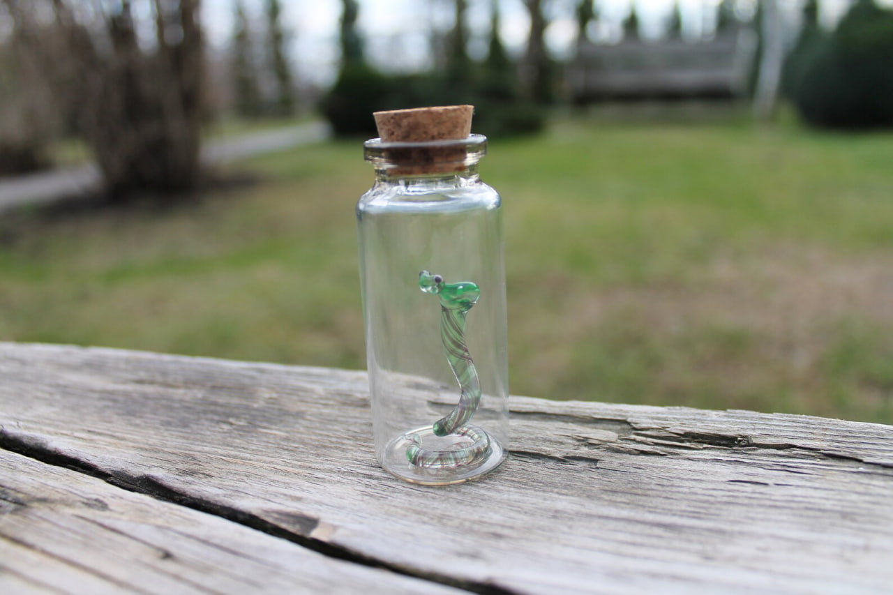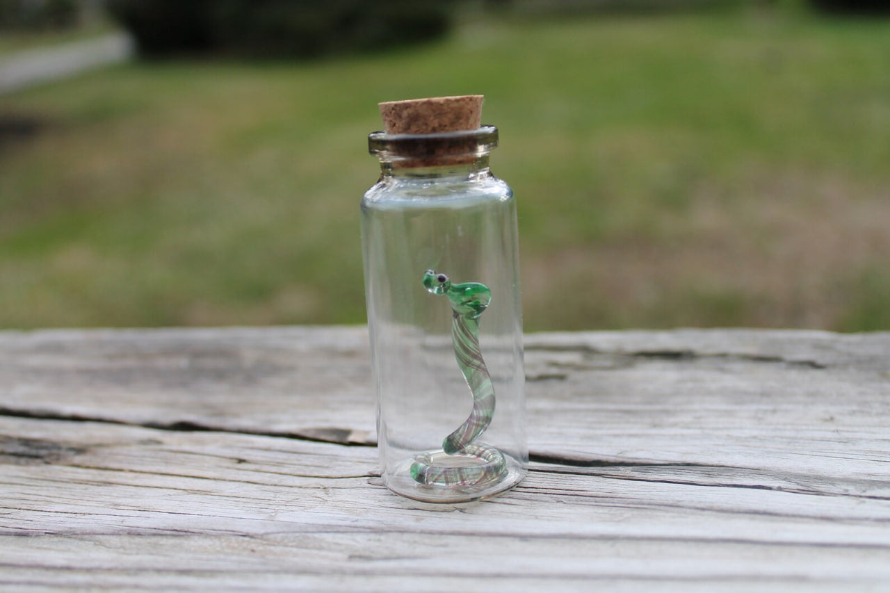 Add a mystical touch to your collection with this handmade uranium glass snake figurine encased in a clear jar with a cork. This miniature snake features delicate green glass with swirling patterns and glows vividly under UV light, creating an enchanting effect!