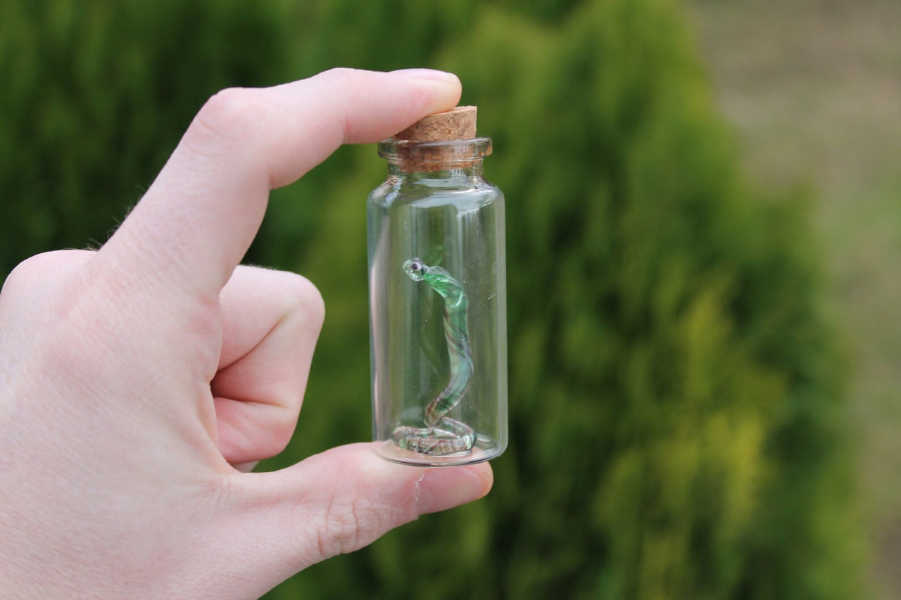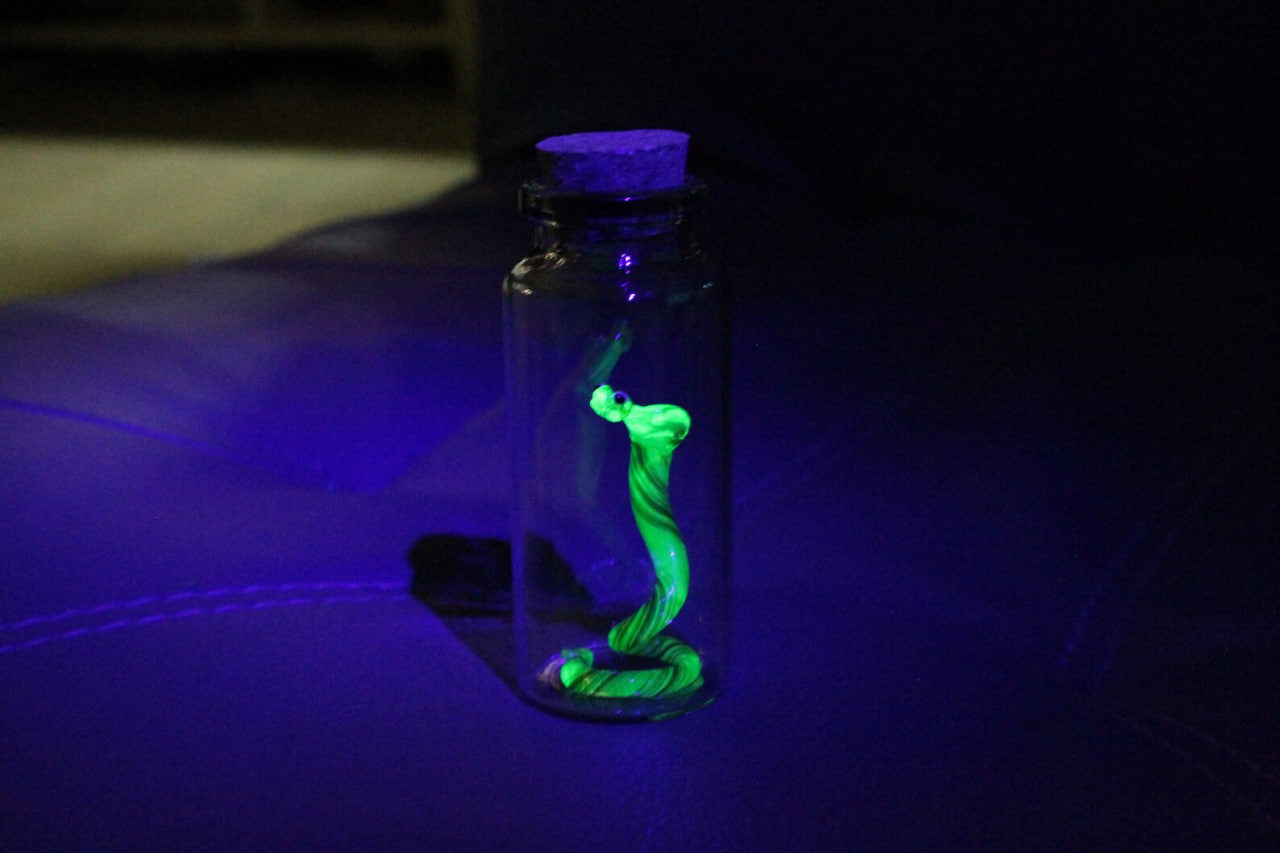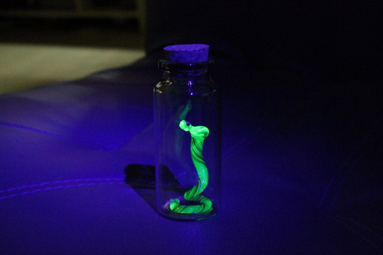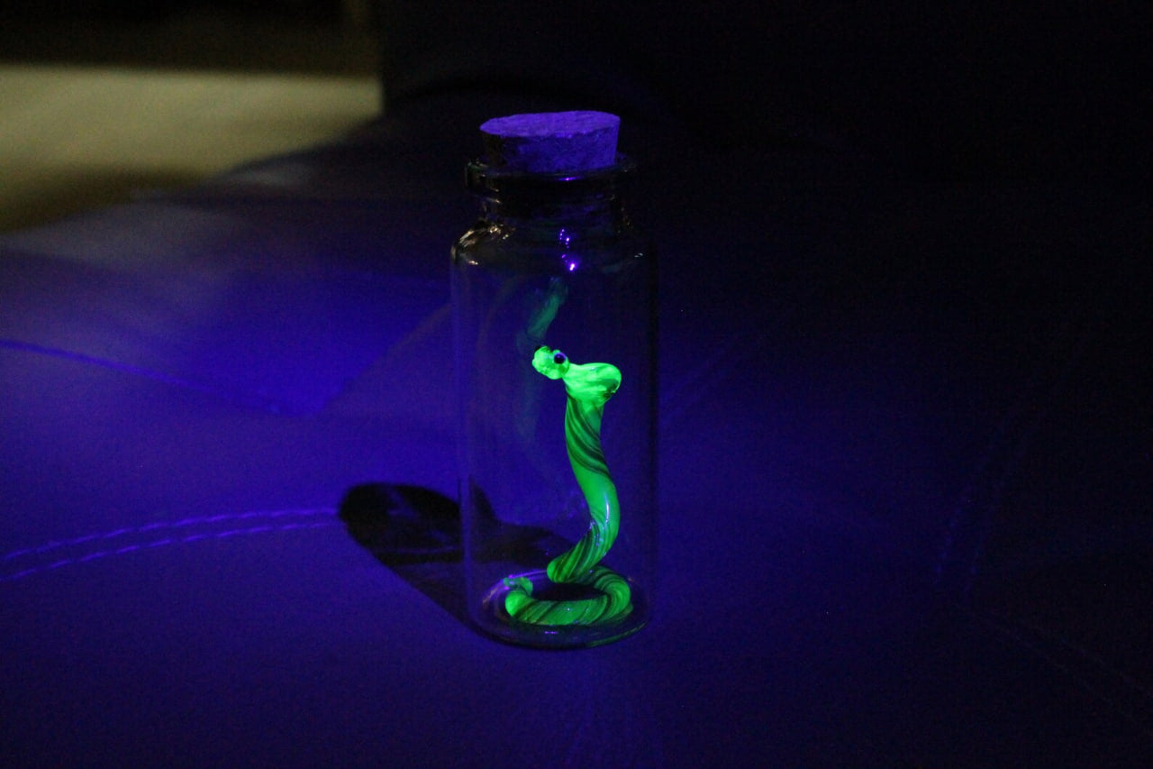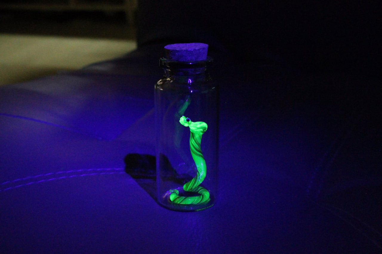 Add a mystical touch to your collection with this handmade uranium glass snake figurine encased in a clear jar with a cork. This miniature snake features delicate green glass with swirling patterns and glows vividly under UV light, creating an enchanting effect!
